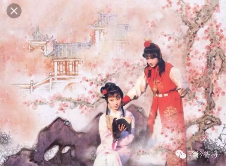 说宝玉在花下看《会真记》,刚好看到落红成阵的时候,一阵风吹过,落花落了他一身,他就兜着花瓣,来到池边,将花瓣抖落池中。看着满地的落花,他正在踌躇,黛玉来了。她担着花锄,挂着纱囊,拿着花帚,葬花来了。这正和了他的心意,而且黛玉给了花更洁净的归宿:用纱囊兜了,埋入花冢,日后随土化了。整个大观园,就这两个人长着一样的九转回肠。