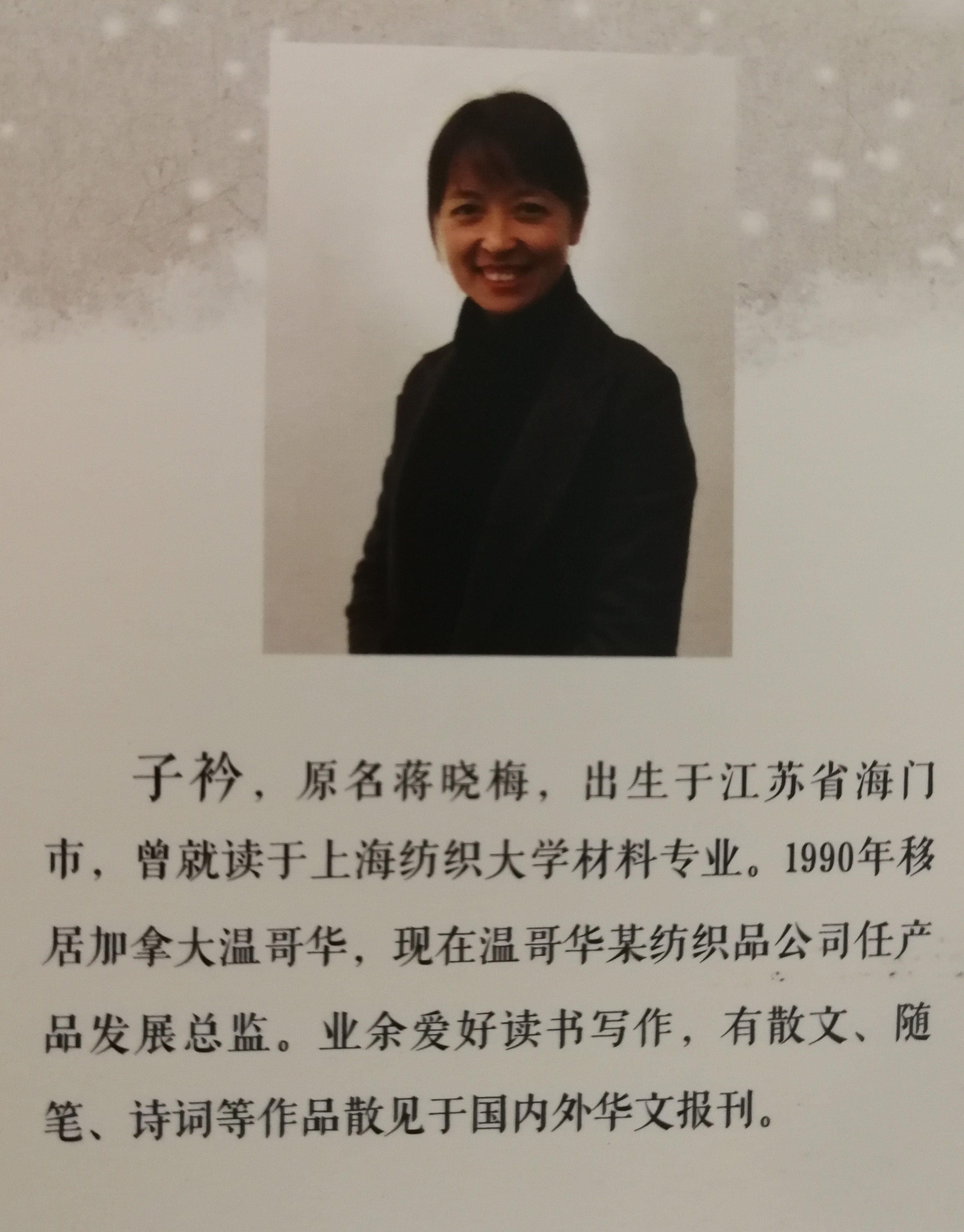 关于我 作者/子衿,来自温哥华的女作家,在子衿身上,并不见故作高深,率真和明媚远远多于忧伤。她的脸上永远挂着一种少女般的笑。那种笑,浅浅的,盈盈的,就像她的文字,已出版散文集《和山楂树一起变老》,并创办了《子衿诗社》,开创“子衿诗词家园”公众号。